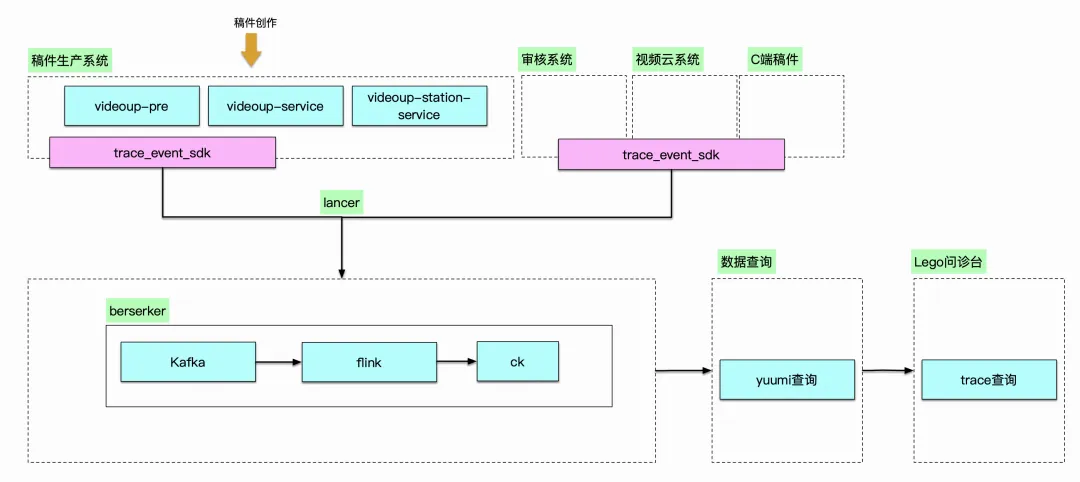 - 服务端的每个业务系统,通过lancer独立上报(如果上下游有origin_trace_id,就建立与服务端trace_id关系)到数据平台