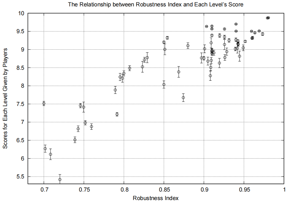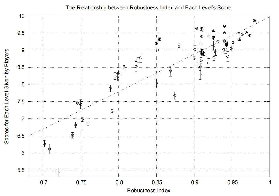 最后利用调查文件的分数统计,得到了玩家对关卡的评价与稳定因子 γ\gamma\gamma 值大致呈正相关的结论,验证了本理论的有效性。