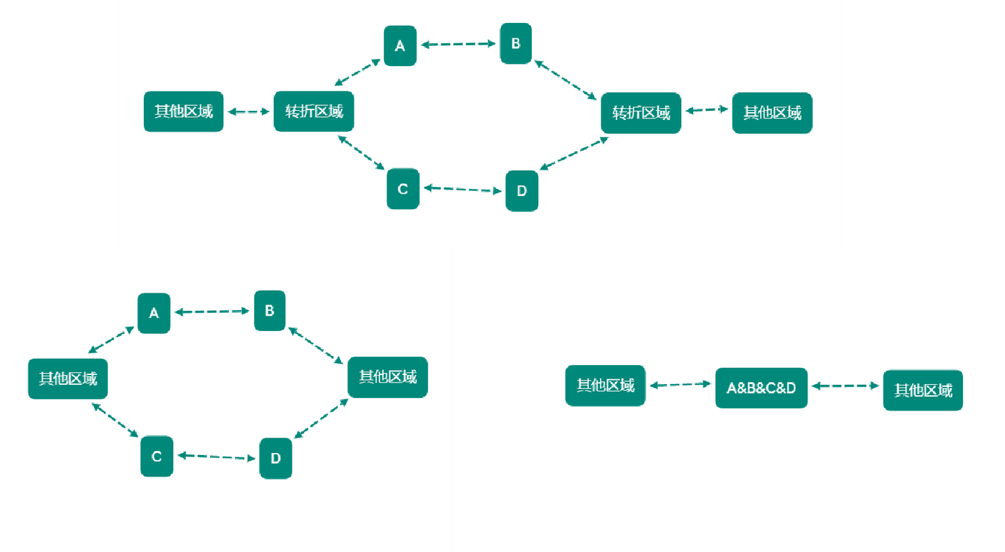 路径的一种,在我们的绘图当中,利用A —— B或A ↔\leftrightarrow\leftrightarrow B来表示。这个连线符号,代表A、B两个开放区域之间是完全连通的关系,从A点出发可以无条件进入B点,从B点出发也可以无条件进入A点。