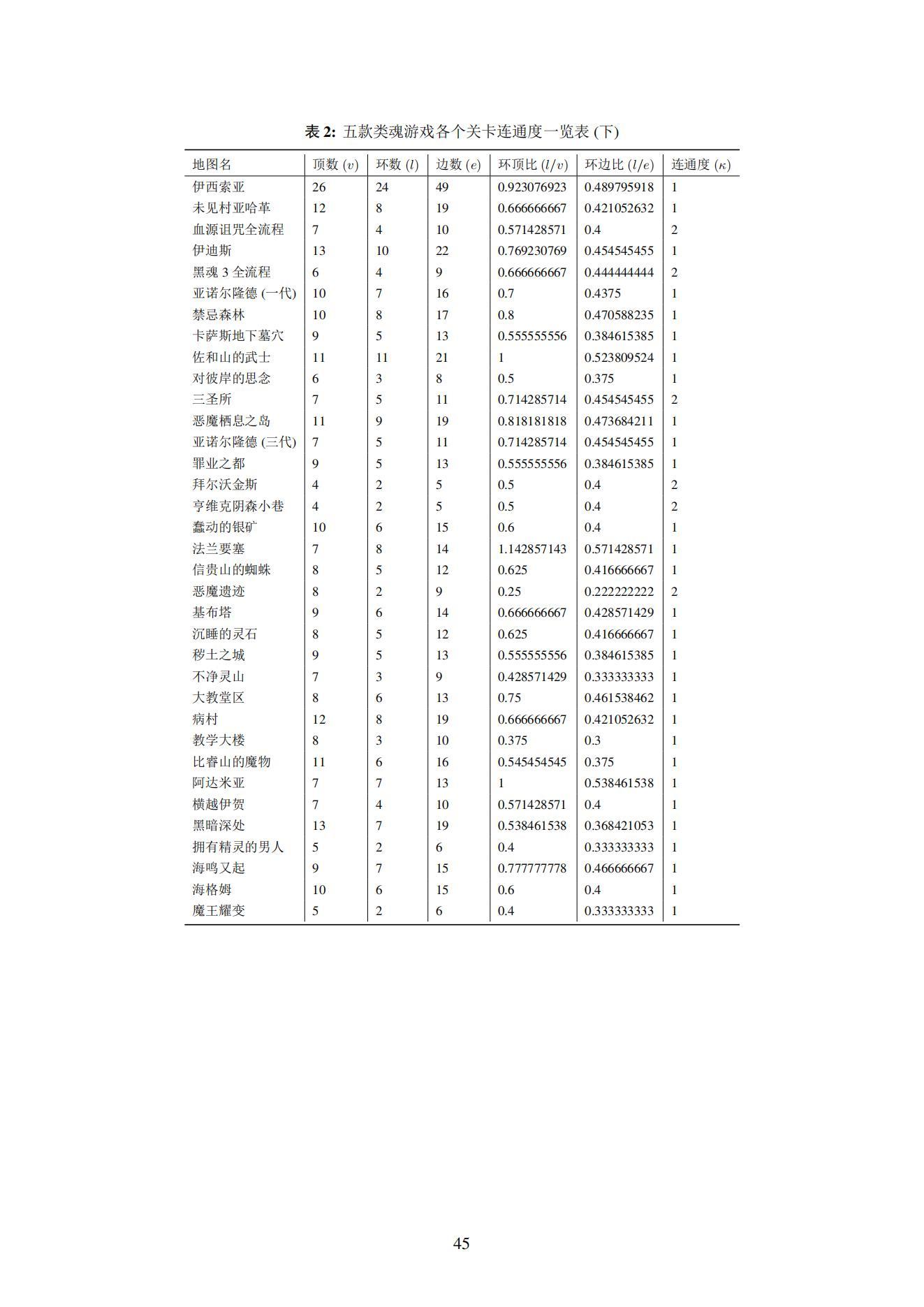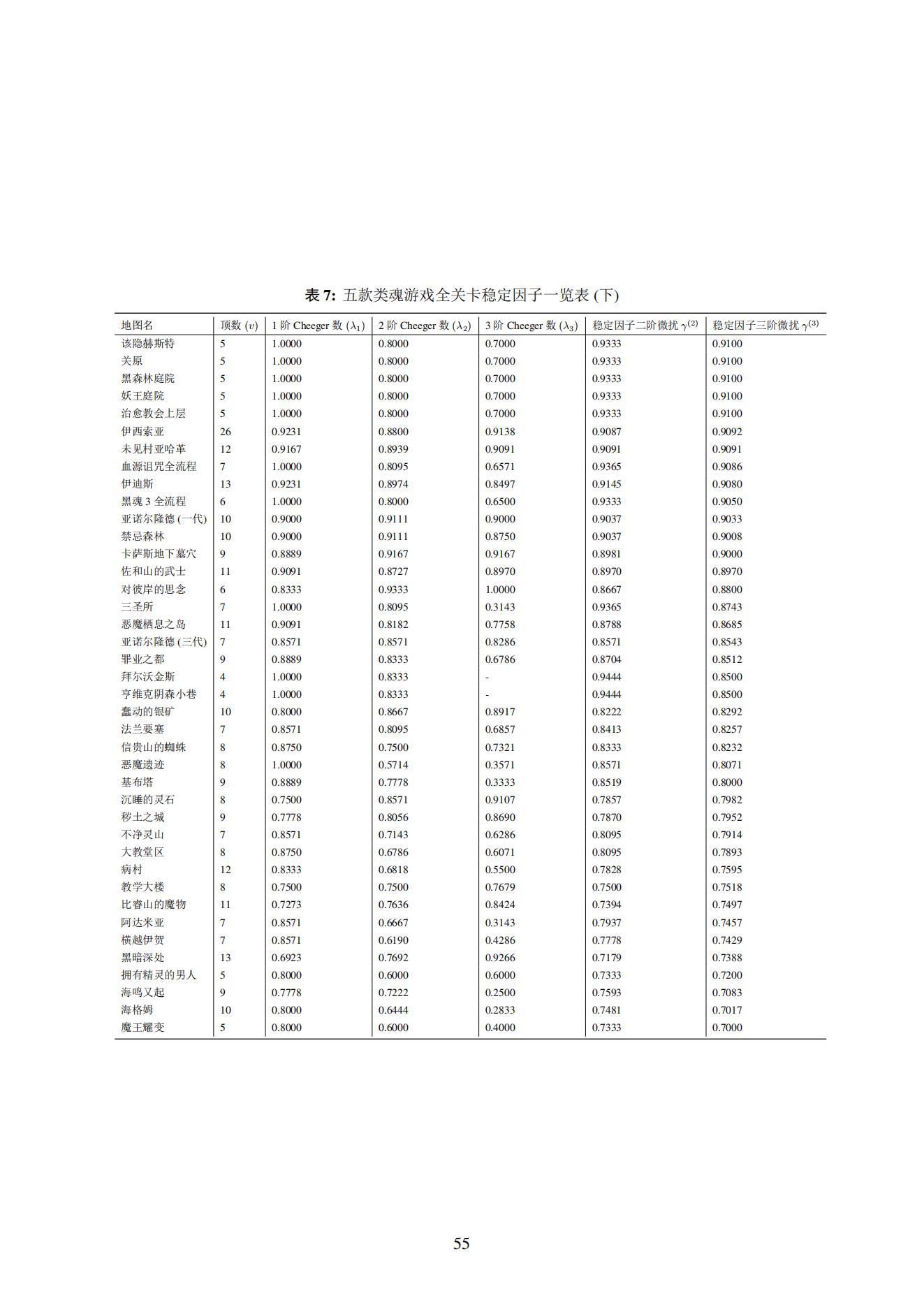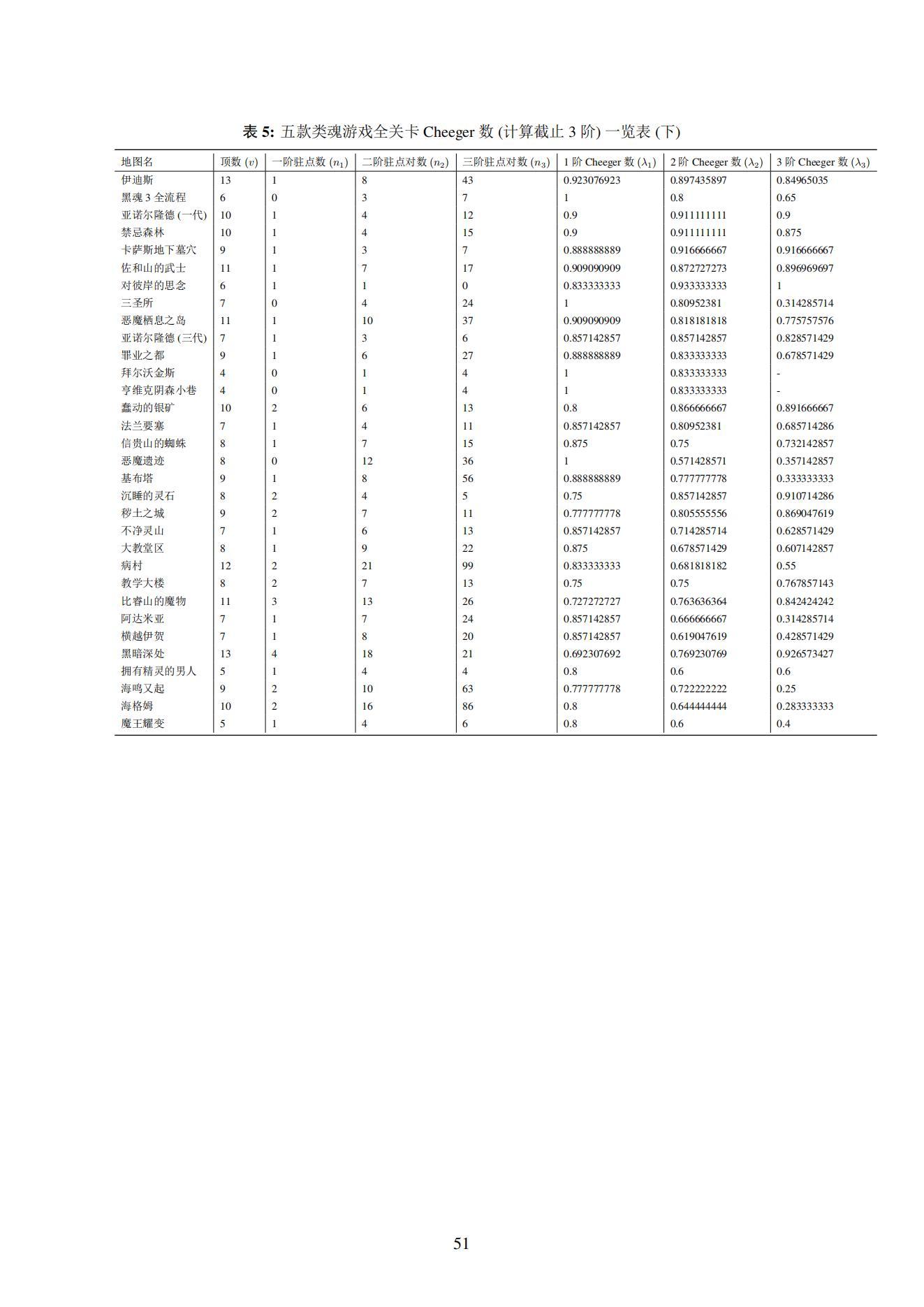 据此,我们选取了五款主流的“类魂”游戏(《黑暗之魂1》、《黑暗之魂3》、《血源诅咒》、《仁王1》、《帕斯卡契约》),并对五款游戏当中的84张地图进行了解析性分析。利用图论、拓扑学等数学工具,我们分别计算了总共84张地图各自的“稳定因子” γ\gamma\gamma 值。( γ\gamma\gamma 定义见4.3小节)