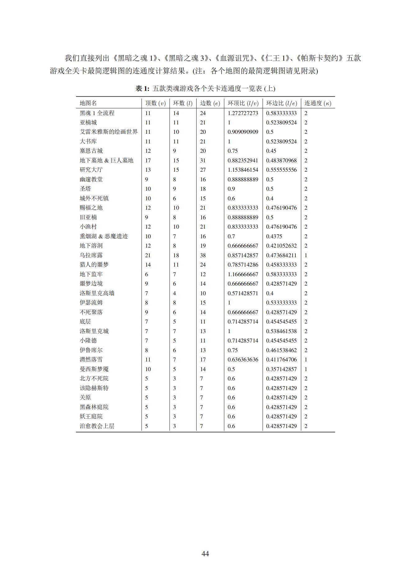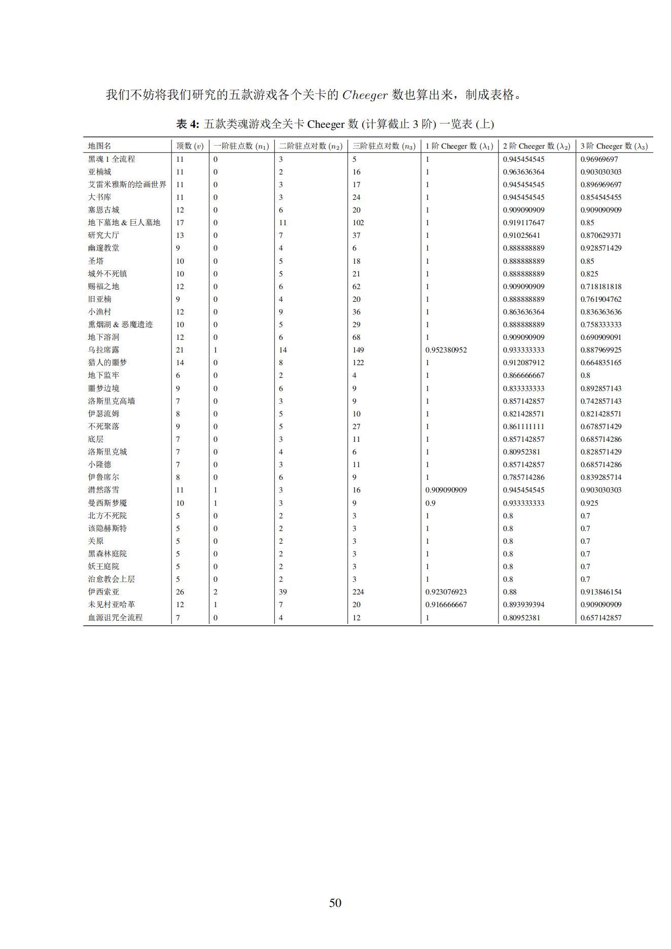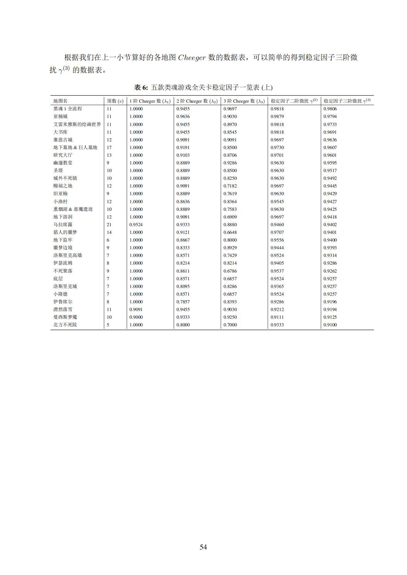 据此,我们选取了五款主流的“类魂”游戏(《黑暗之魂1》、《黑暗之魂3》、《血源诅咒》、《仁王1》、《帕斯卡契约》),并对五款游戏当中的84张地图进行了解析性分析。利用图论、拓扑学等数学工具,我们分别计算了总共84张地图各自的“稳定因子” γ\gamma\gamma 值。( γ\gamma\gamma 定义见4.3小节)