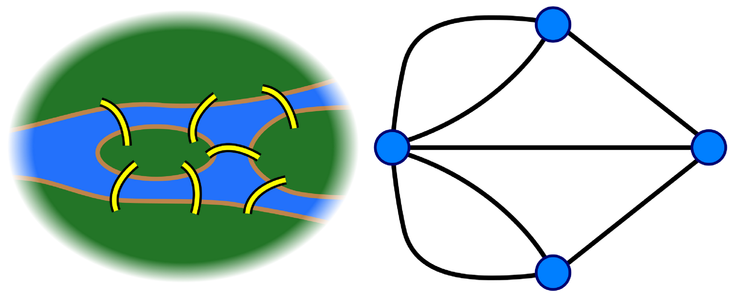 在1735年东普鲁士的柯尼斯堡 (加里宁格勒) 市区跨普列戈利亚河两岸,河中心有两个小岛。小岛与河的两岸有七条桥连接。