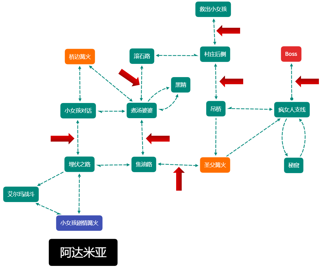 曼西斯梦魇、血源诅咒全流程、未见村亚哈革、亚楠城、小渔村的最简逻辑图