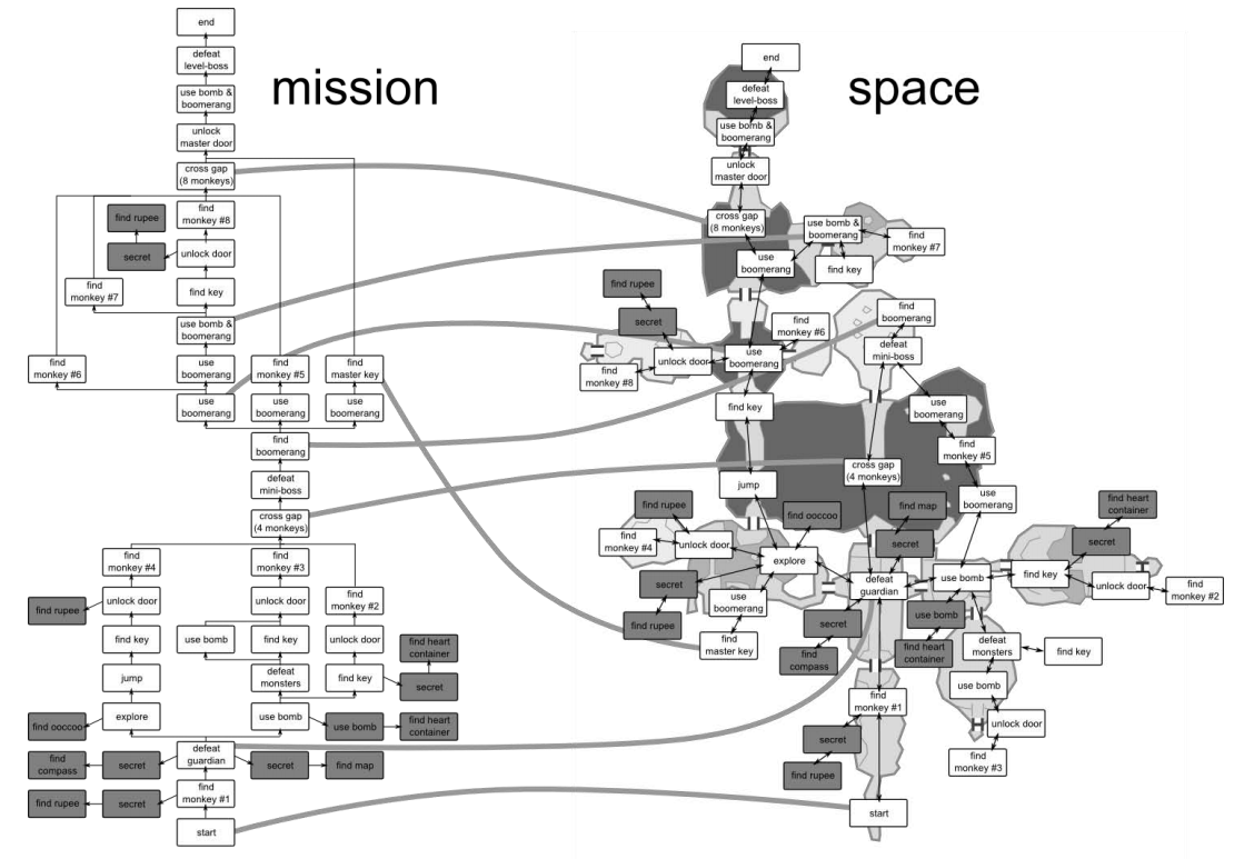 到了2010年,Joris Dormans撰写的《Adventures in Level Design》一文[1]开始进入箱庭式关卡设计领域。在这项工作中,他试图利用图论的方法“有限开圆覆盖”划分出一张地图的“开放区域”,这张地图就是著名游戏《塞尔达传说:黄昏公主》当中的地图关卡:森林寺庙。借此,Joris Dormans实现了将关卡的“Space”(空间几何属性)转化为“Mission”(任务逻辑属性)。