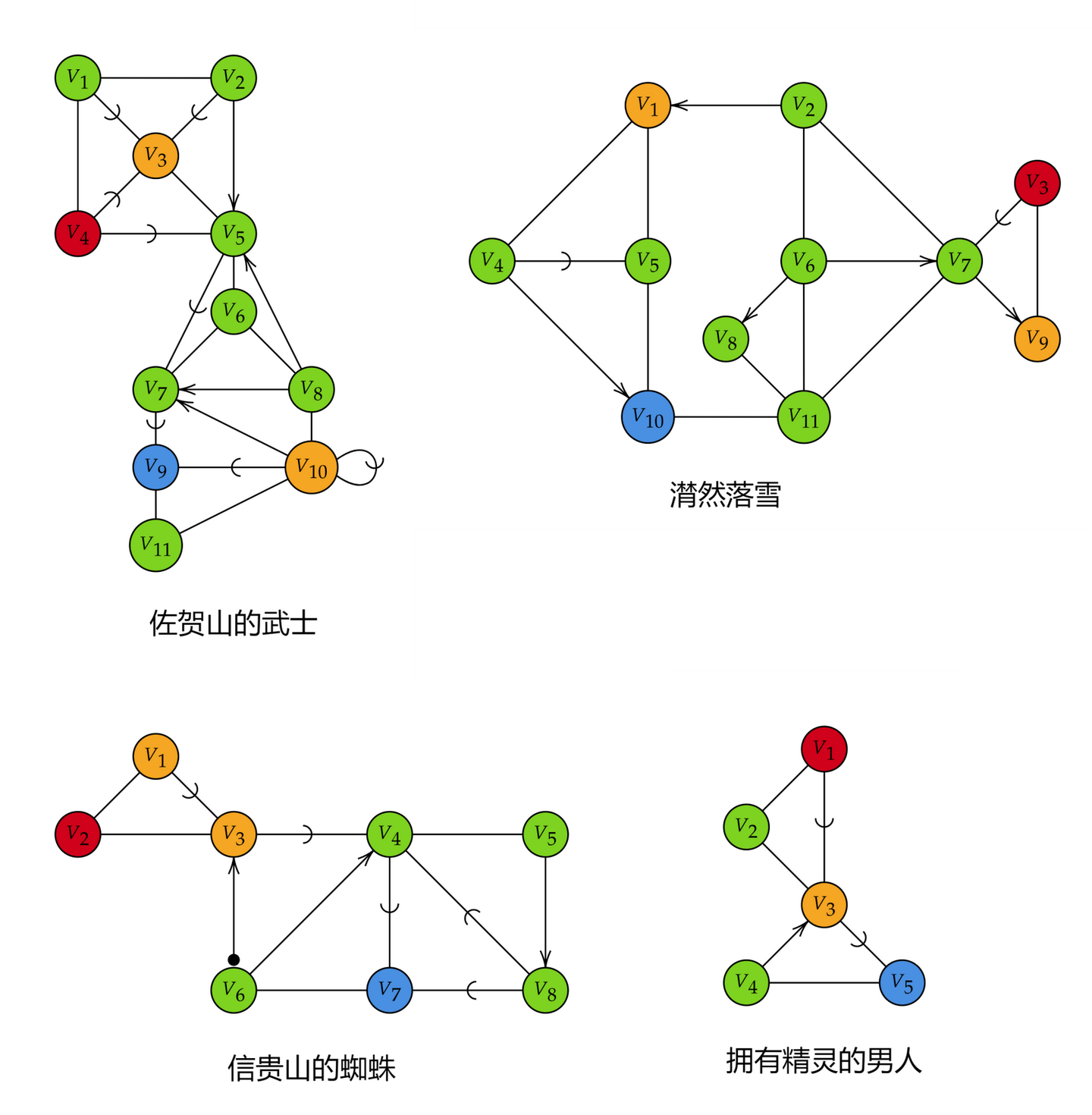 佐贺山的武士、潸然落雪、信贵山的蜘蛛、拥有精灵的男人的最简逻辑图