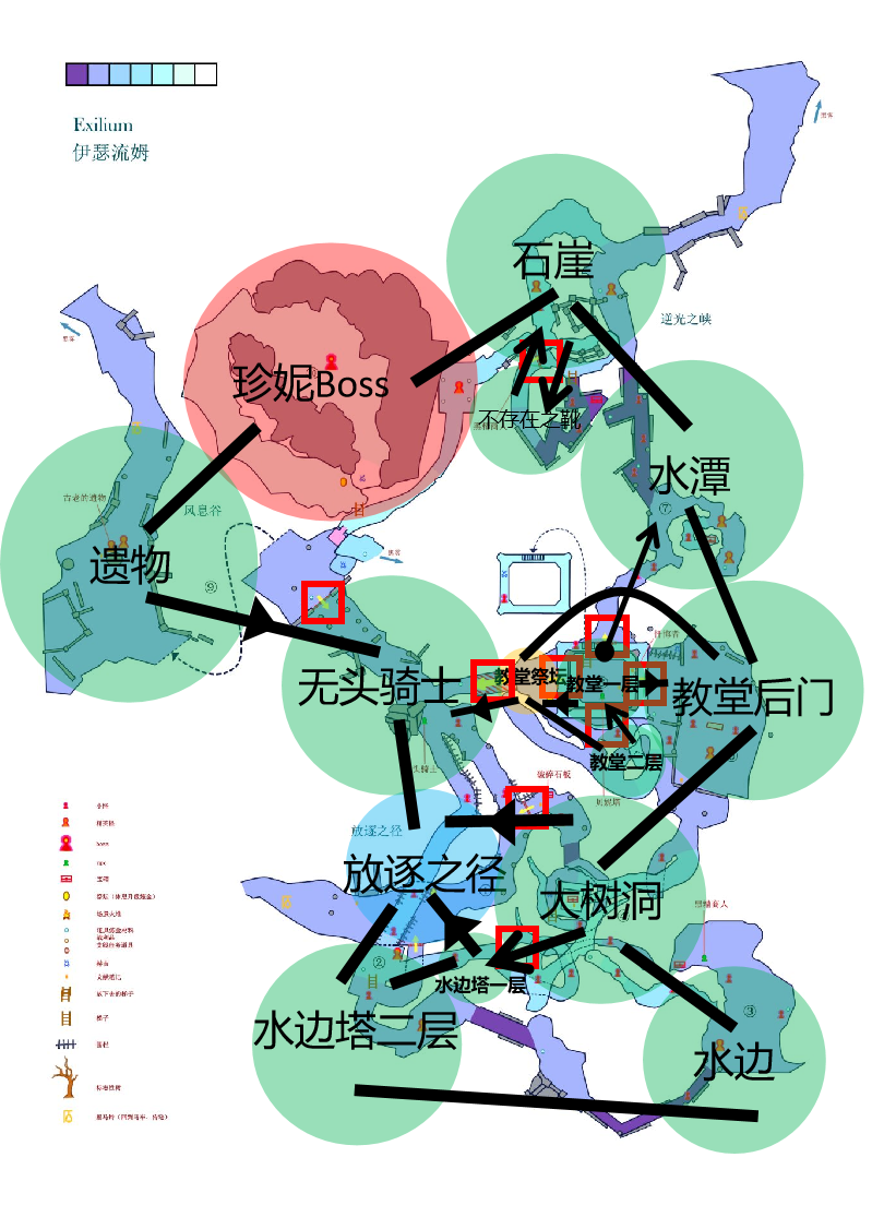 魂1绘画世界、底层、城外不死镇、地下墓地、病村、北方不死院的最简逻辑图